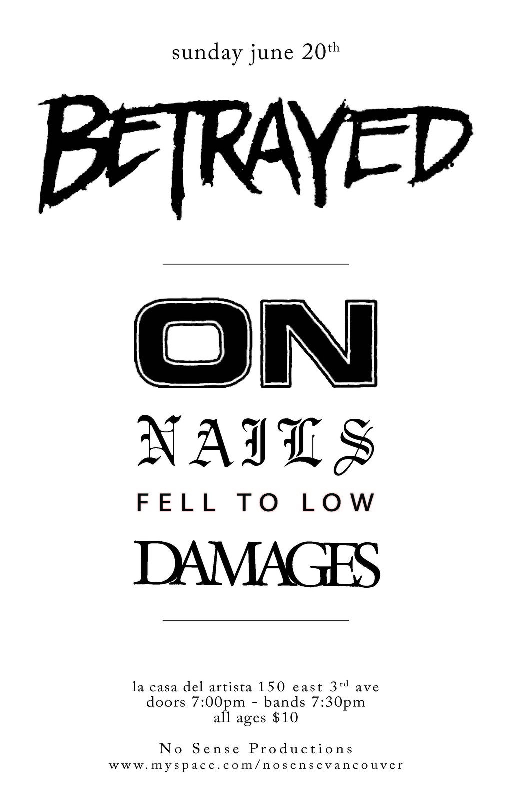 Betrayed are flying to the NW for 2 shows, and Vancouver is one of the lucky cities. For opening acts we have a truly amazing lineup; ON (from Seattle, React Records), Nails (from Cali, Six Feet Under Records), Fell To Low (from Cali), and Damages (new 7" on React Records)