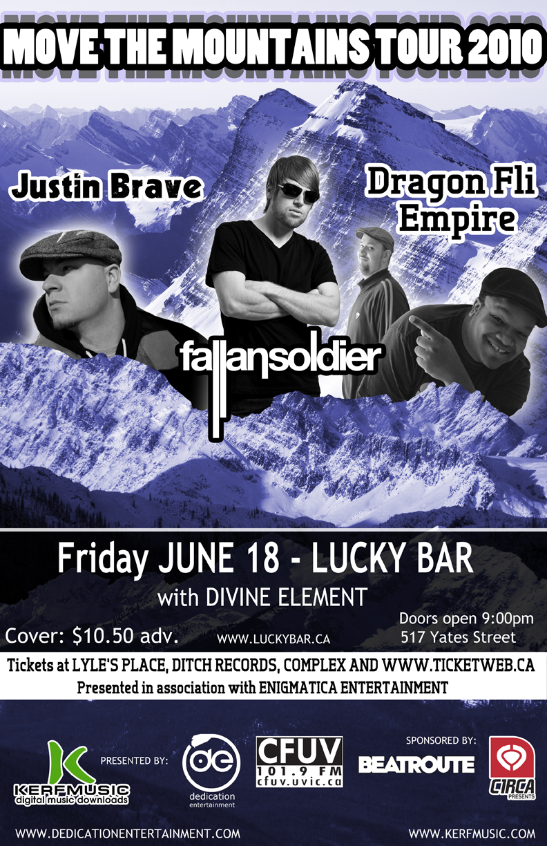 Get ready to enjoy a night full of the grooviest hip hop, funk/jazz you've heard in awhile when the Moving the Mountains Tour touches down in Victoria. Enjoy some of the finest hip hop in Canada with Calgary's Dragon Fli Empire, Justin Brave aka Just-B (formerly from Victoria), Fallan Soldier, & Cypher's Divine Element.