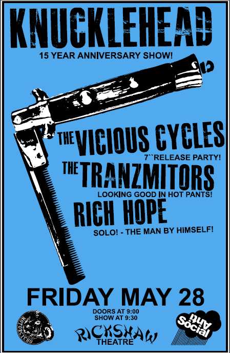 Knucklehead celebrates 15 years of Canadian Punk Rock with their friends the Vicious Cycles mc, who are releasing their very first record!!! The Tranzmitors joined the party and have 2 new records coming out as well. Rich Hope will be starting us off with his catchy brand of dirty southern blues, like only he can!!!