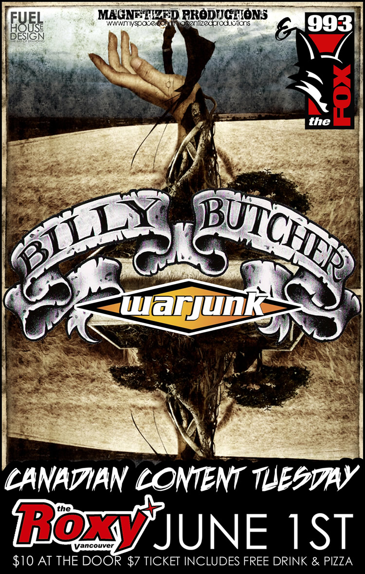 Magnetized Productions, The Roxy & The Fox proudly presents Billy Butcher & Warjunk on Tuesday, June 1st, 2010 at The Roxy at 932 Granville Street in Vancouver. Doors open at 7:00 p.m. The first band starts at 8:30, Cost:$7 w/ Ticket,$10 without. includes One Drink & Pizza