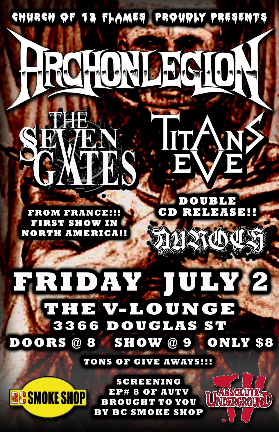 Ok folks this is the next show I got for ya'....JULY 2 nd @ the V-lounge(3366 douglas st) Local metal warriors ARCHON LEGION!!!!! with the SEVEN GATES from FRANCE!!! for their North American debut show!!!!!! Along with AUROCH and TITANS EVE both from Van having their new cd ready for us for release!!!! There will be tons of giveaways and be sure to get there from the start as all the bands on this line up kick mega ass!!!!!! Look foreward to seeing ya'll in the pitt m/ m/ p.s. this is my first show back promting in Vic and am stoked to back in the scene....
