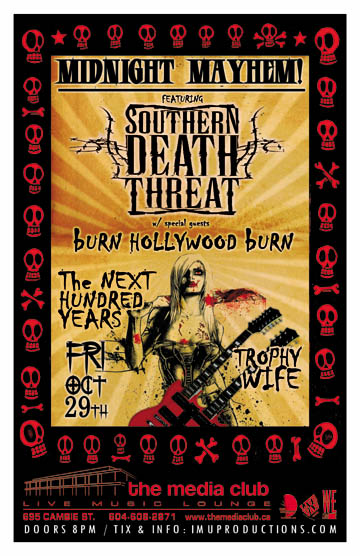 . Friday, October 29th IMU presents MIDNIGHT MAYHEM! Featuring SOUTHERN DEATH THREAT, BURN HOLLYWOOD BURN, The NEXT HUNDRED YEARS & TROPHY WIFE @ The Media Club, 695 Cambie Street . Doors 8pm