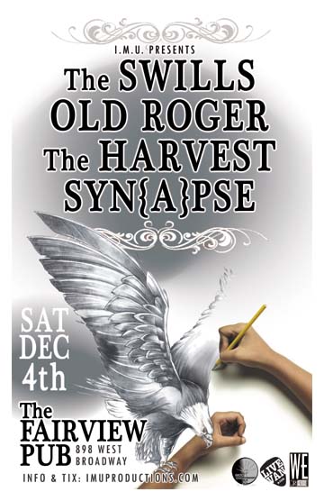. Saturday, December 4th IMU presents The SWILLS, OLD ROGER, The HARVEST & SYN{A}PSE @ The Fairview Pub, 898 West Broadway . Doors 9pm / Cover $10 . Purchase advance tickets online @ http://www.imuproductions.com/tix