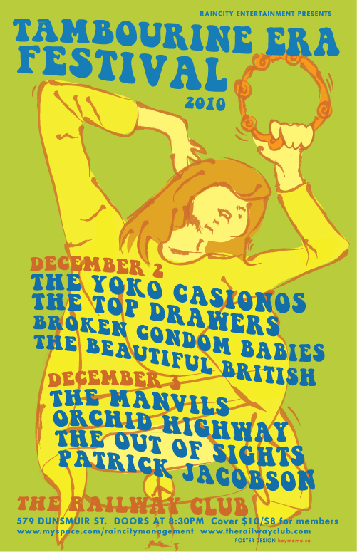 TAMBOURINE ERA FESTIVAL Celebration of Vancouver rock 'n' roll music showcasing local favorites The Manvils, The Yoko Casionos, Orchid Highway, The Top Drawers, Broken Condom Babies, The Out Of Sights, Patrick Jacobson, and The Beautiful British. Presented by Raincity Entertainment. Dec. 2-3, 8:30 pm, Railway Club (579 Dunsmuir). Tix $10 at the door, $8 for members, www.myspace.com/raincitymanagement.
