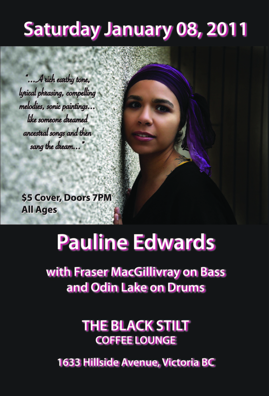 Pauline's last show before leaving Victoria. Come check it out, pick up the CD, bid farewell, have a latte.
