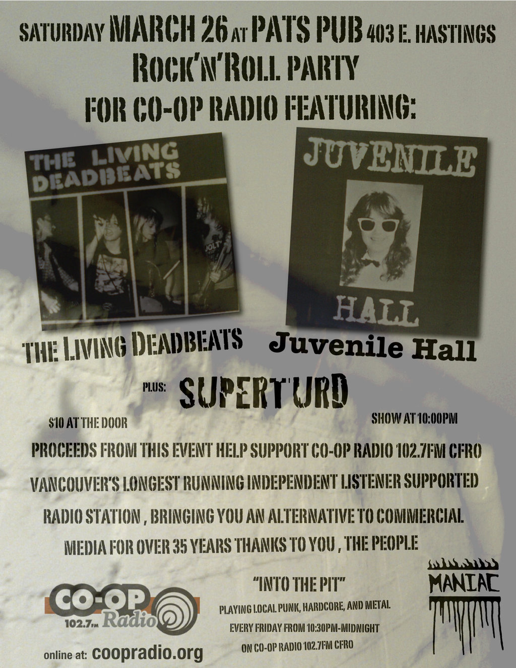 CO-OP Radio 102.7fm Rock'n'Roll Party: The Living Deadbeats, Juvenile Hall, SuperTurd @ Pat's Pub Mar 26 2011 - Feb 7th @ Pat's Pub