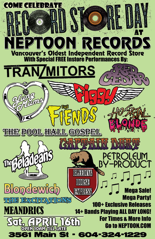 Record Store Day @ Neptoon Records! FREE ALL DAY & NIGHT!: The Tranzmitors, Red Cedar, Piggy, The Fiends, The Excitations, The Poolhall Gospel, Blondewich, The Beladeans, Yung Mums, Captain Dust, Petroleum By-Product, The Meandrics, Hospital Blonde, The Bleeding Hors, The Excitations
