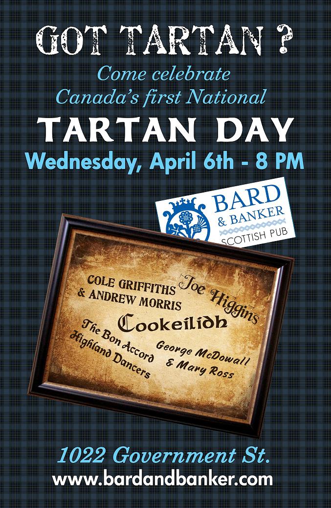 **Tartan Day Celebration**: Cookeilidh, Joe Higgins, Cole Griffiths & Andrew Morris, George McDowall & Mary Ross @ Bard & Banker Apr 6 2011 - Dec 22nd @ Bard & Banker