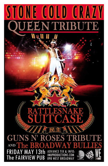 . Friday, May 13th IMU presents STONE COLD CRAZY Queen Tribute w/ RATTLESNAKE SUITCASE Guns N Roses Tribute & The BROADWAY BULLIES @ The Fairview Pub, 898 West Broadway . Doors 8pm / Cover $10 . Purchase advance tickets online @ http://www.imuproductions.com/tix