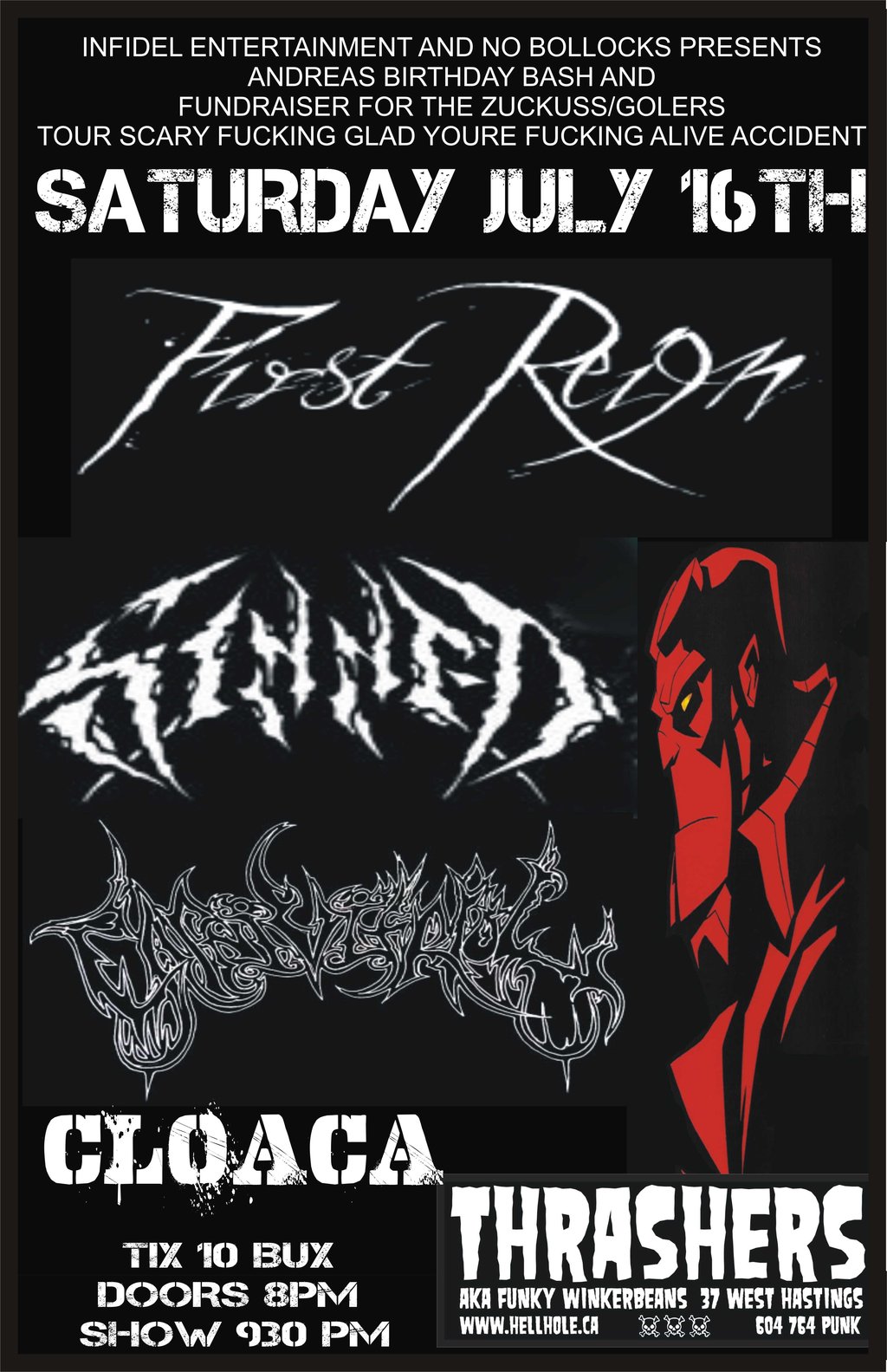 ANDREAS BIRTHDAY BASH AND GOLERS/ ZUCKUSS FUNDRAISER: First Reign, Sinned, Carnivitriol , CLOACA