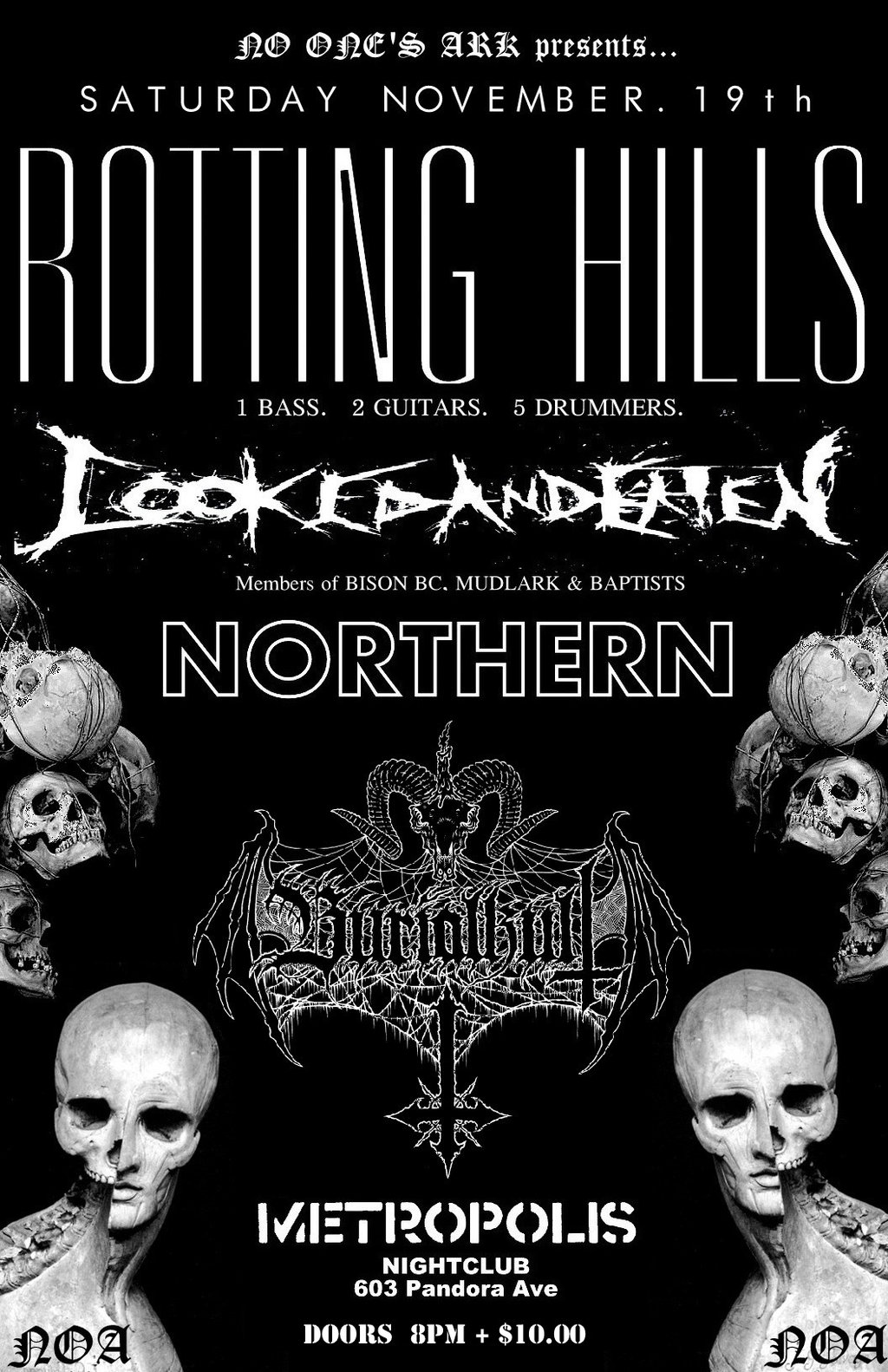 1 BASS - 2 GUITARS - 5 DRUMMER DOOM ONSLAUGHT!!!: ROTTING HILLS, COOKED AND EATEN, BURIALKULT, Northern - Victoria @ Metropolis Nov 19 2011 - Feb 6th @ Metropolis