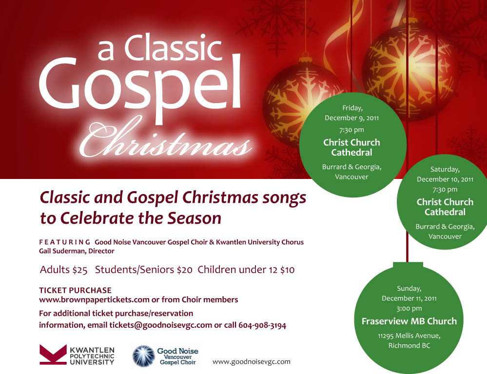 If you love Christmas music and love Gospel Music, this is a 'must-see" concert. Two dynamic choirs presenting both "classic" Christmas and the "gospel" Christmas music and joining forces in a 130 voice choir, backed by some of Canada's finest musicians. Directed by Gail Suderman, with Michael Kalanj on Hammond B3, Laurence Mollerup on Bass, Elliot Polsky on drums and Ingrid Stitt on Alto and Soprano Saxophone.