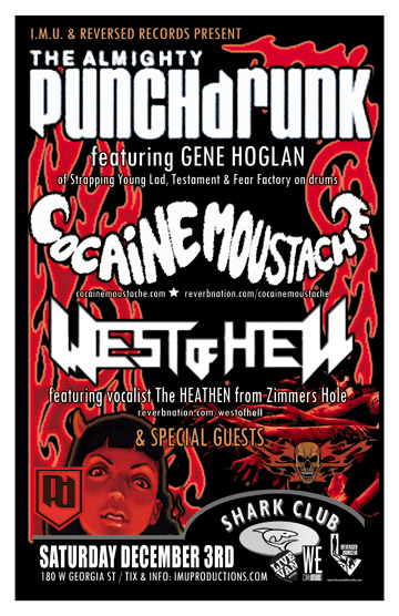 . Saturday, December 3rd IMU & Reversed Records presents The ALMIGHTY PUNCH DRUNK featuring GENE HOGLAN w/ COCAINE MOUSTACHE, WEST OF HELL & TIRED @ The Shark Club, 180 West Georgia Street . Doors 8:30pm . Show 9pm sharp! Purchase advance tickets directly via the bands & online @ http://www.imuproductions.com/tix