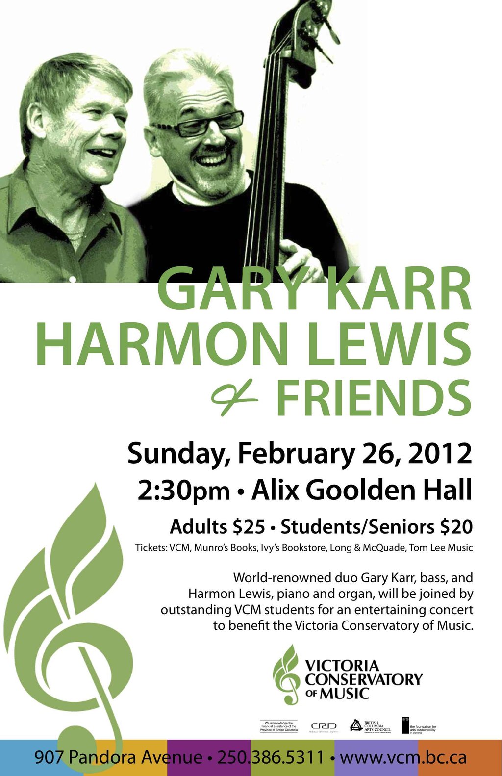 Renowned artists Gary Karr, bass, and Harmon Lewis, organ and piano, join forces with VCM students to present a concert to benefit the Conservatory. The Karr-Lewis Duo has built a schedule of appearances that has included festivals all over North America, Great Britain, continental Europe, Russia, Israel, Australia and Asia; this is a concert not to be missed!
