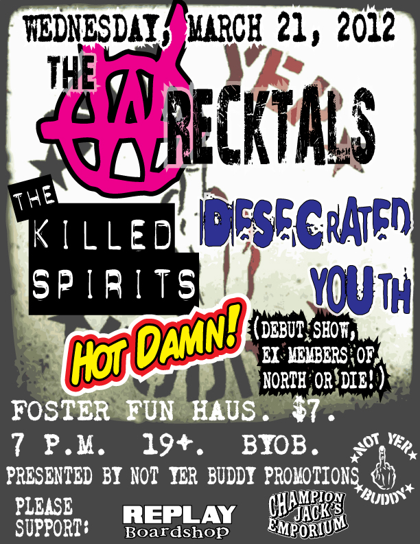 The WRECKTALS (http://www.facebook.com/pages/The-Wrecktals/9176630271) back in Abby for the first time in nearly 2 years with their good buds and our good buds The KILLED SPIRITS (http://www.facebook.com/thekilledspirits) with Desecrated Youth (http://www.facebook.com/pages/Desecrated-Youth/139161766148695), Monkeys In Drag and the debut of Hot Damn! (former North or Die members)