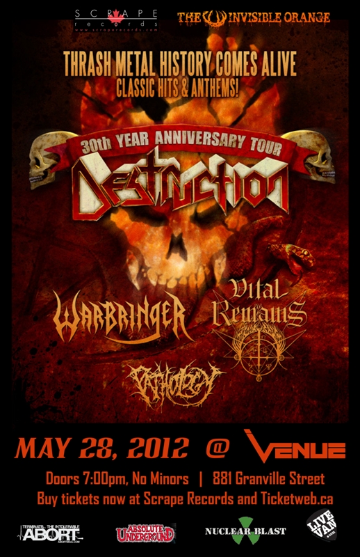 THE 30TH ANNIVERSARY TOUR FEATURES HEADLINING CALIBER OPENING ACTS HAND PICKED BY DESTRUCTION THEMSELVES, INCLUDING HEAVY HITTERS WARBRINGER AND VITAL REMAINS ALONG WITH UP & COMERS PATHOLOGY… THIS IS A PACKAGE OF EPIC PROPORTIONS!