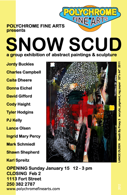 an exhibition of abstract work by: Jordy Buckles, Charles Campbell, Caite Dheere, Donna Eichel, David Gifford, Cody Haight, PJ Kelly, Lance Olsen, Ingrid Mary Percy, Mark Schmiedl and Shawn Shepherd