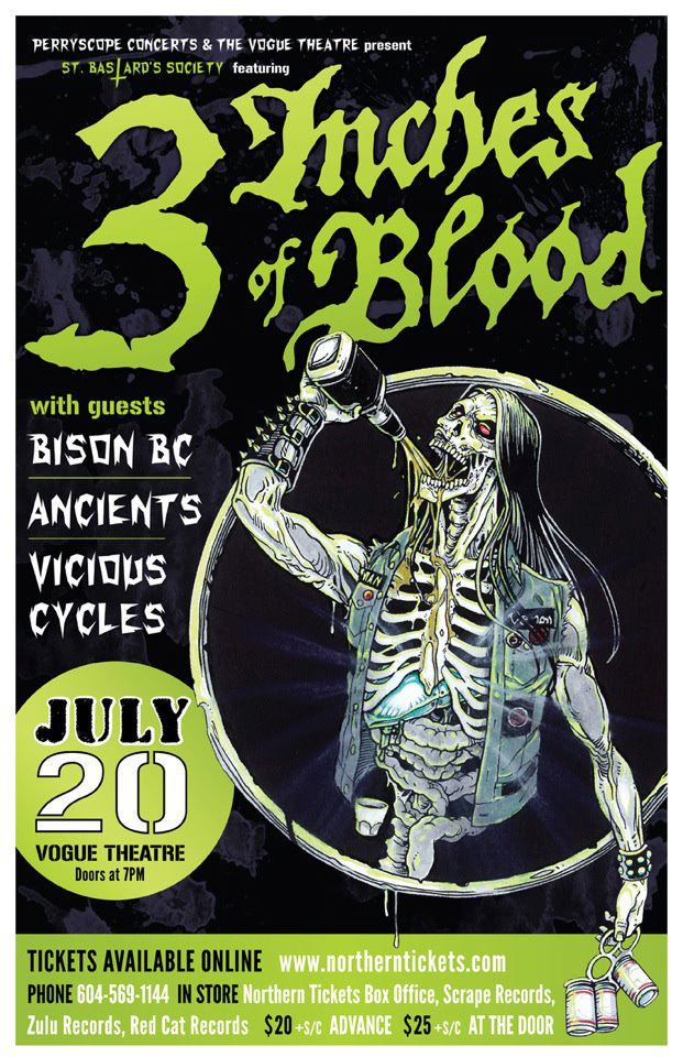 When you're old and grey and still tattooed proudly but wrinkly, you'll tell your kids of the night that East Van metal took over Granville Street and invaded The Vogue Theatre. Beware short skirts and tourists, Perryscope Concerts and The Vogue Theatre bring you St. Bastard's Society featuring 3 Inches of Blood with Bison BC, Ancients and Vicious Cycles.