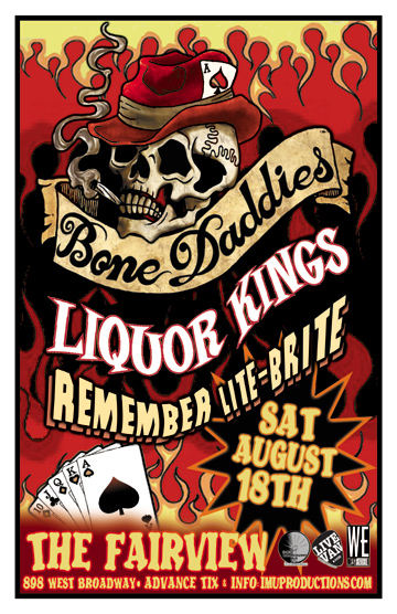 . Saturday, August 18th IMU presents BONE DADDIES, The LIQUOR KINGS & REMEMBER LITE-BRITE @ The Fairview, 898 West Broadway . Doors 8pm / Purchase advance tickets directly via the bands and online @ http://www.imuproductions.com/tix