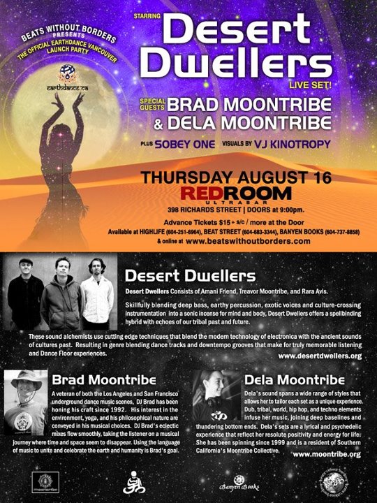BEATS WITHOUT BORDERS PRESENTS THE OFFICIAL EARTHDANCE VANCOUVER LAUNCH PARTY WITH: DESERT DWELLERS, BRAD MOONTRIBE, DELA MOONTRIBE, SOBEY ONE, VJ Kinotropy @ The Red Room Aug 16 2012 - Feb 7th @ The Red Room