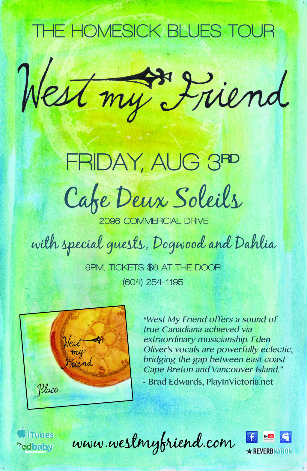 Victoria's indie-roots quartet West My Friend will be hitting up Vancouver's Cafe Deux Soleil as a stop on their Homesick Blues Tour. Joined by Dogwood & Dahlia.
