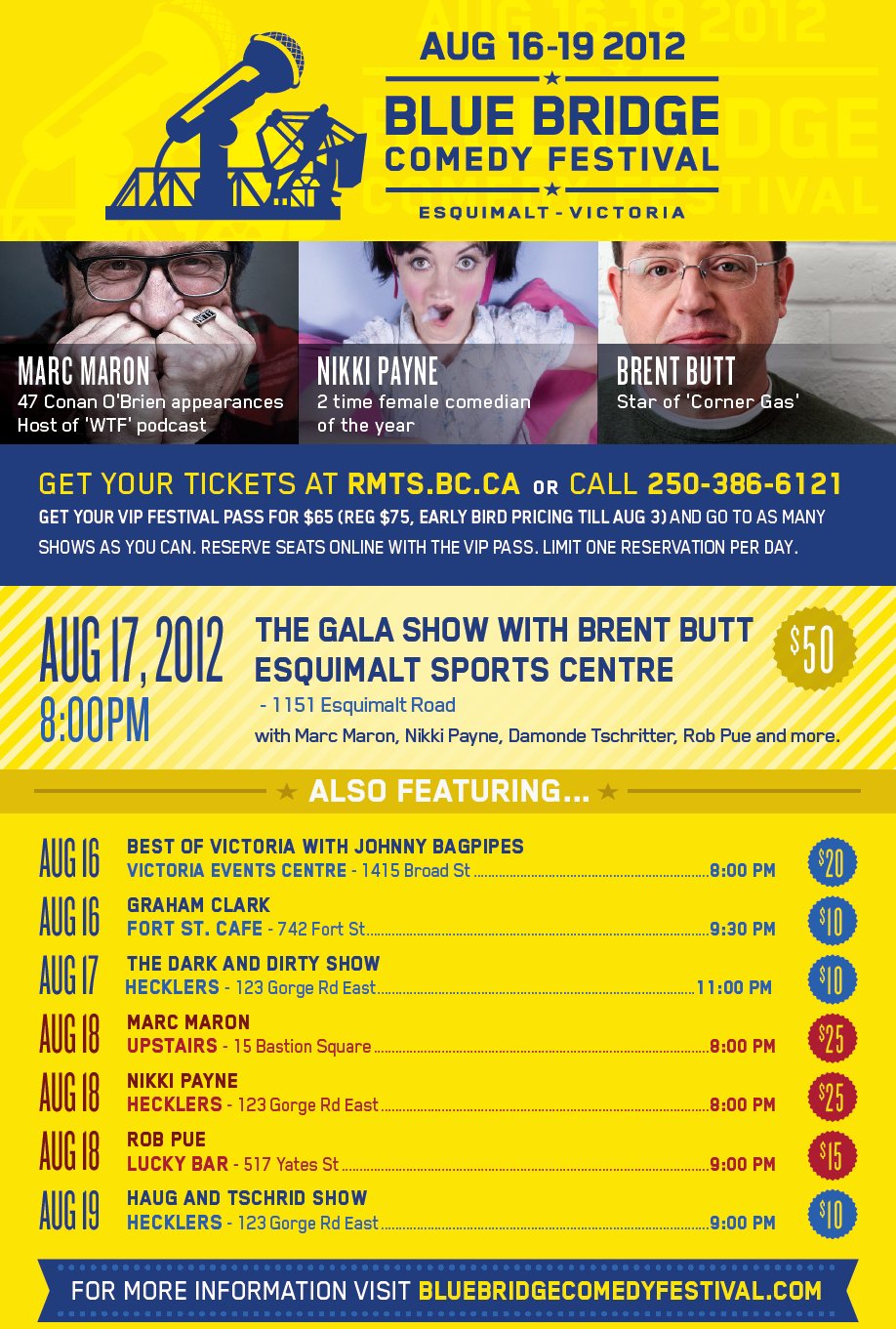 The first annual Blue Bridge Comedy Festival runs from August 16-19 at various locations throughout the city. Esquimalt is proudly hosting “the” show of the festival. MC’d by Brent Butt of Corner Gas; featuring Marc Maron with 47 Conanan O’Brian appearances and 2 time Female Comedian of the Year Nikki Payne the Gala will be the premier event of the festival.