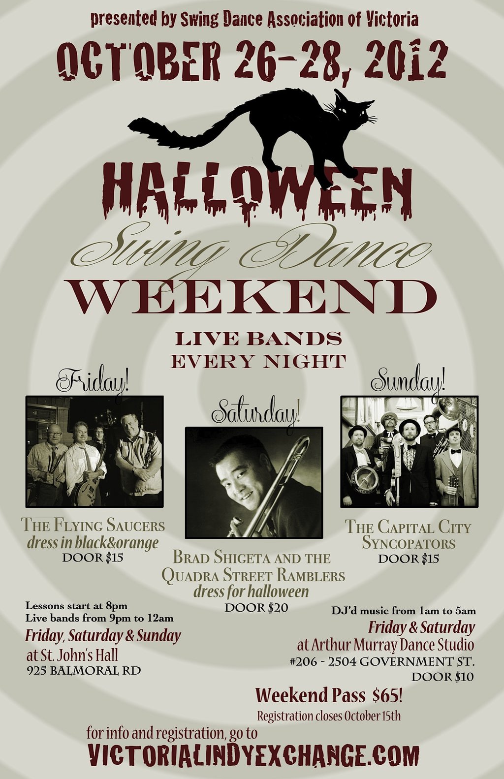 We have a great line-up of bands playing: The Flying Saucers (Friday), Brad Shigeta and the Quadra Street Ramblers (Saturday) and The Capital City Syncopators (Sunday). Plus late-night DJ'd music at Arthur Murray Studio! Friday night dress in orange and black; Saturday night, dress in your Halloween-finest!