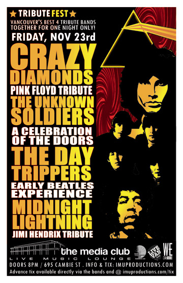 . THIS FRIDAY! November 23rd IMU presents TRIBUTEFEST! The UNKNOWN SOLDIERS A Celebration Of The Doors, CRAZY DIAMONDS Pink Floyd Tribute, MIDNIGHT LIGHTNING Hendrix Tribute & The DAY TRIPPERS Early Beatles Experience @ The Media Club, 695 Cambie St . Doors 8pm / Show start 8:30pm . Purchase $12 advance tickets directly via the bands or online @ http://www.imuproductions.com/tix . $15 cover at the door