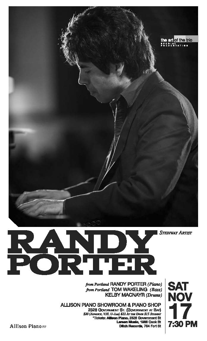 A "house concert" style performance featuring American Jazz pianist and Steinway artist Randy Porter! With renowned bassist Tom Wakeling (Portland) & Kelby MacNayr, on drums. In the intimate showroom at Allison Piano, 2328 Government St. (Government at Bay). Plenty of free parking on site.