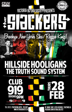 Performing alongside The Slackers will be Victoria's own legendary reggae/punk/ska outfit Hillside Hooligans and Canada's best west coast rocksteady, reggae ska vinyl selectors The Truth Soundsystem!