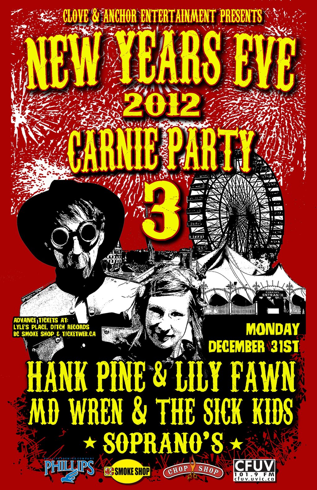 oin us for a New Years Eve Carnie Party 3 with Hank Pine & Lily Fawn playing two sets! We'll have the room filled with Carnival themed props, sexy dancers, cotton candy, free champagne, awesome drink specials and tons of prizes to be won. Plus don't forget to reserve a room at the Capital City Center Hotel and get a $45 rate when mentioning sopranos 250-953-1000.