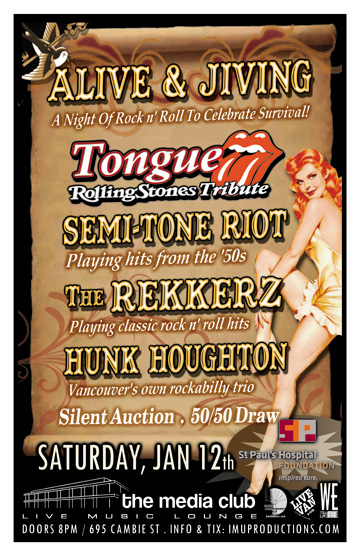 . Saturday, January 12th IMU presents KATE BARSKY’S ALIVE AND JIVING ~ TEN YEAR ANNIVERSARY CELEBRATION Fundraiser for St. Paul’s Hospital Foundation featuring TONGUE Rolling Stones Tribute, SEMI-TONE RIOT, The REKKERZ & HUNK HOUGHTON @ The Media Club, 695 Cambie St . Doors 8pm / Purchase advance tickets at the door, directly via bands, by calling 604-910-2376 or online @ http://www.imuproductions.com/tix