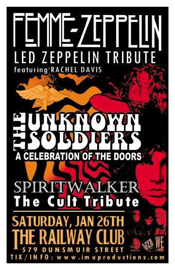 . Saturday, January 26th IMU presents FEMME ZEPPELIN Led Zeppelin Tribute feat. Rachel Davis, The UNKNOWN SOLDIERS: A Celebration Of The Doors & SPIRITWALKER Cult Tribute @ The Railway Club, 579 Dunsmuir . Doors 9pm / Purchase advance tickets online @ http://www.imuproductions.com/tix