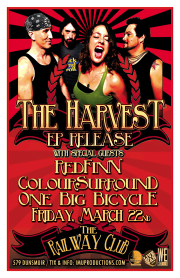 . Friday, March 22nd IMU presents The HARVEST EP Release Party w/ special guests REDFINN, COLOURSURROUND & ONE BIG BICYCLE @ The Railway Club, 579 Dunsmuir . Show 9pm / Purchase advance tickets online @ http://www.imuproductions.com/tix