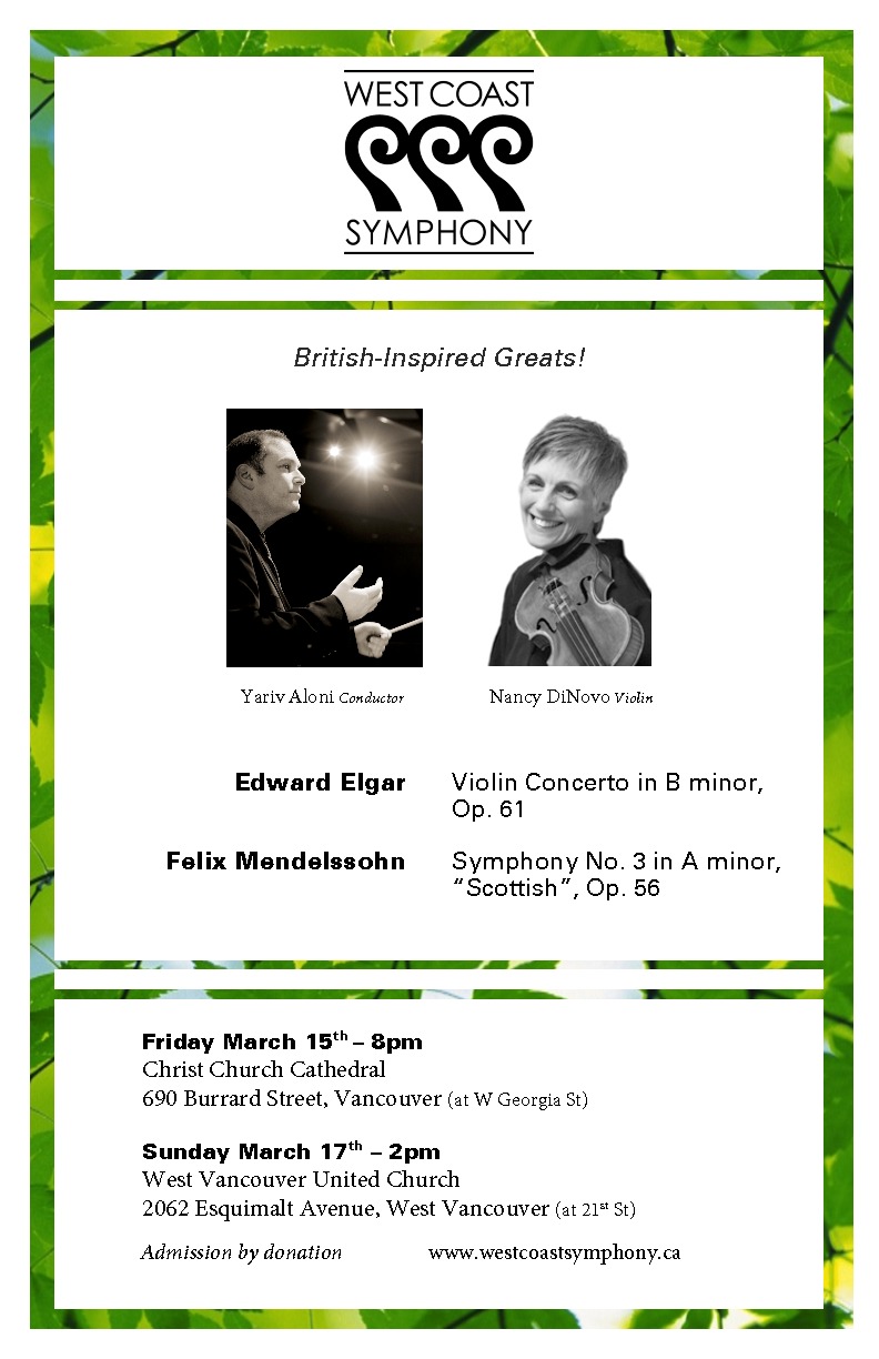 We welcome two of our favourite guests artists, Guest Conductor Yariv Aloni and Nancy DiNovo for this concert. Together we will perform the seductive Elgar Violin Concerto and then conclude our concert with Mendelssohn's jewel of a symphony, the Scottish.