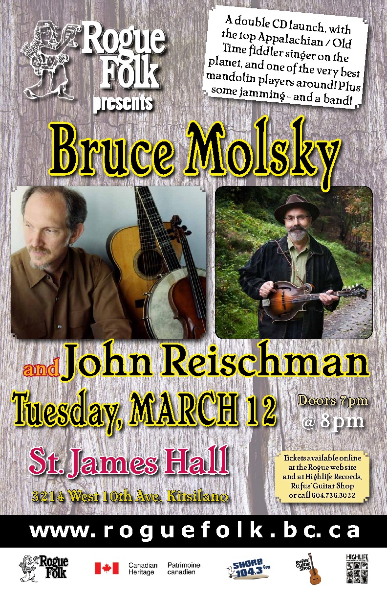 Fiddler Bruce Molsky launches his seventh solo CD, If It Ain't Here When I Get Back, while mandolin wizard John Reischman launches his third solo album, Walk Along John.