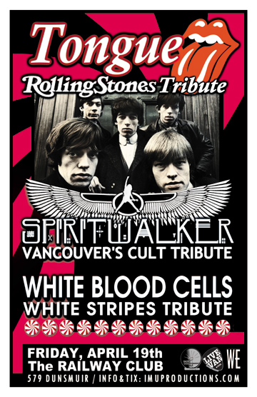 . Friday April 19th IMU presents TONGUE Rolling Stones Tribute, SPIRITWALKER Cult Tribute & WHITE BLOOD CELLS White Stripes Tribute @ The Railway Club, 579 Dunsmuir . Doors 9pm / Purchase advance tickets online @ http://www.imuproductions.com/tix