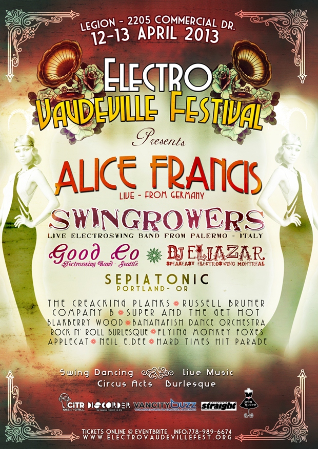 Electro Vaudeville Festival Apr 12&13: Alice Francis, Hard Times Hit Parade, Swingrowers , Flying Monkey Foxes, Super and the Get Hot, Neil E. Dee, Company B, Blackberry Wood, Good Co, Bananafish Dance Orchestra, Sepiatonic, The Creaking Planks