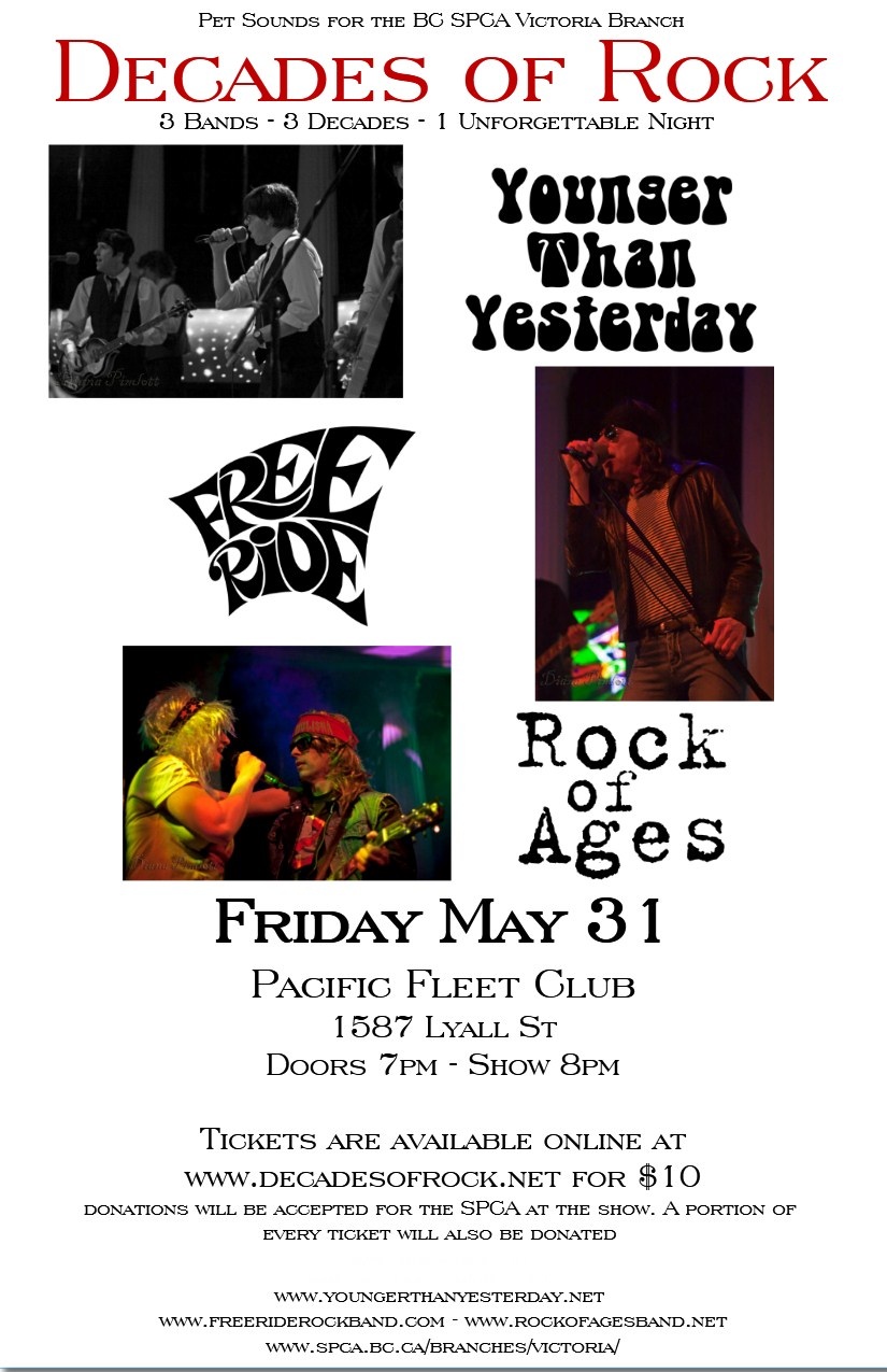 Decades of Rock - Pets Sounds For The BC SPCA Victoria Branch -: Younger Than Yesterday, Free Ride, Rock Of Ages @ Pacific Fleet Club May 31 2013 - Feb 8th @ Pacific Fleet Club