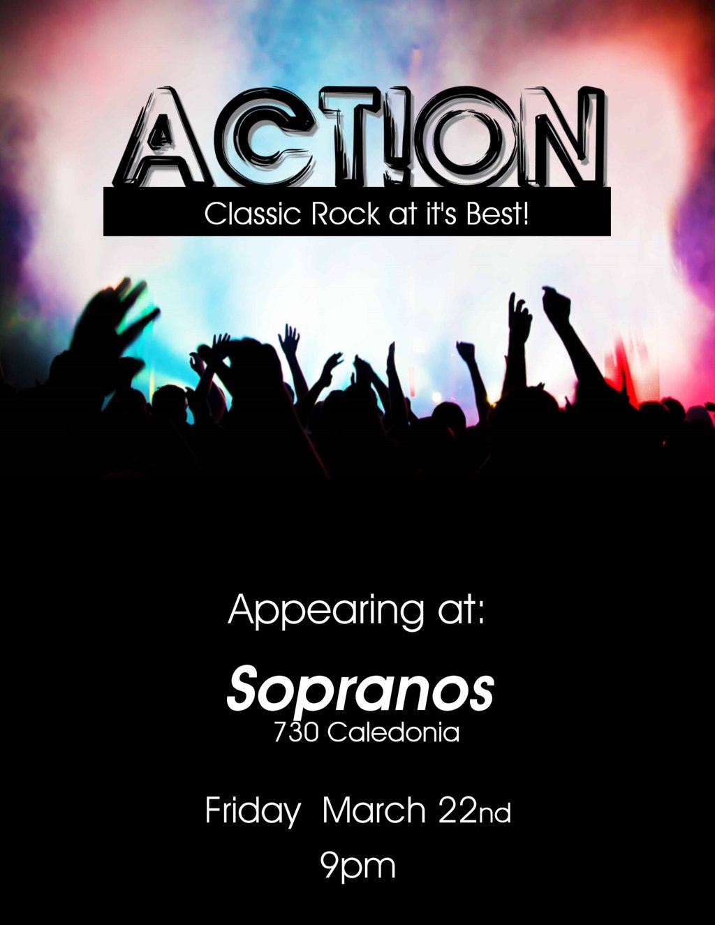 Friday March 22nd join us for party band Action playing three sets of classic Rock N' Roll at it's best. Action cover all the hits from Billy Idol, ZZ Top, Lynnard Skynnard, The Rolling Stones, Pink Floyd, The Eagles, Trooper, Train and many more.