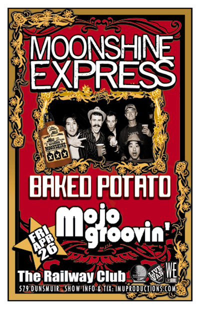 . Friday April 26th IMU presents MOONSHINE EXPRESS, BAKED POTATO & MOJO GROOVIN' @ The Railway Club, 579 Dunsmuir . Doors 9pm / Purchase advance tickets online @ http://www.imuproductions.com/tix