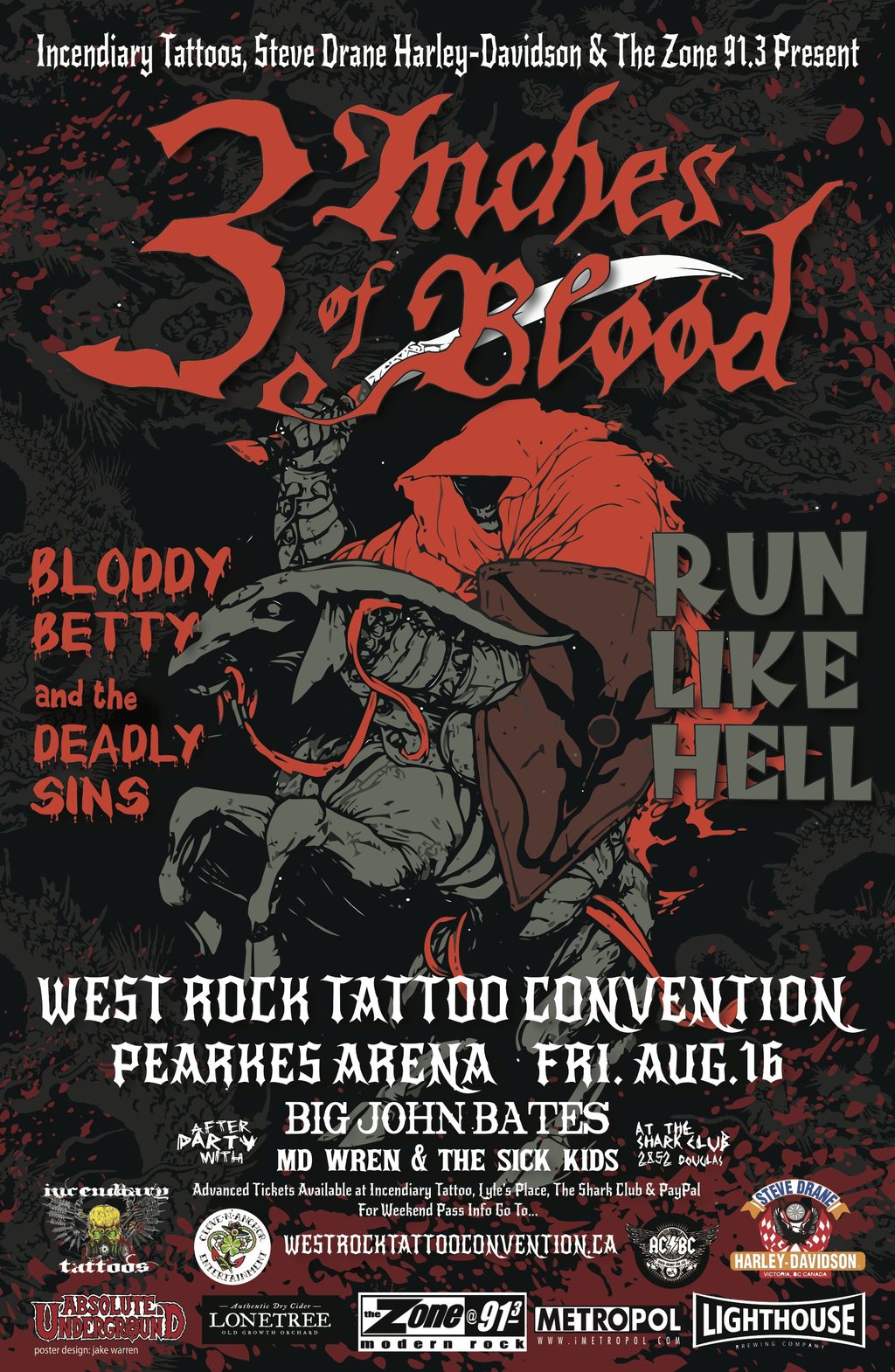 1st Annual West Rock Tattoo Convention brought to you by Incendiary Tattoos, Steve Drane Harley Davidson and 91.3 The Zone, will be held from Aug. 16th to the 18th at Pearkes arena in Victoria B.C. and will be featuring artists from all over Canada and the US, live music featuring 3 Inches of Blood Friday night and Madchild Saturday night, live body suspension performances by The RISE Body Suspension Crew, shows by Bloody Betty and Ruby Entertainment! Tattoo contests and more!!