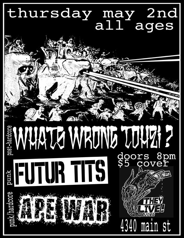 ALL AGES Punk / Post Hardcore At They Live! Video 4340 Main St. Five dollar cover. Featuring local acts;