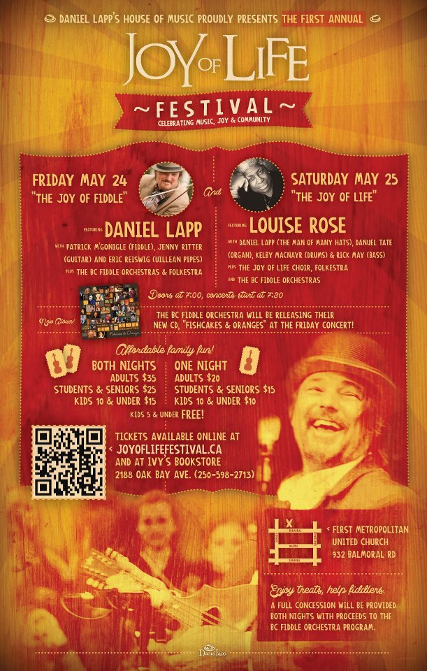 Saturday, May 25 - Joy of LIFE Concert featuring Louise Rose, Daniel Lapp, Danuel tate (organ), Kelby McNayr (drums), Rick May (bass), Joy of Life Choir, Folkestra, and the BC Fiddle Orchestras.