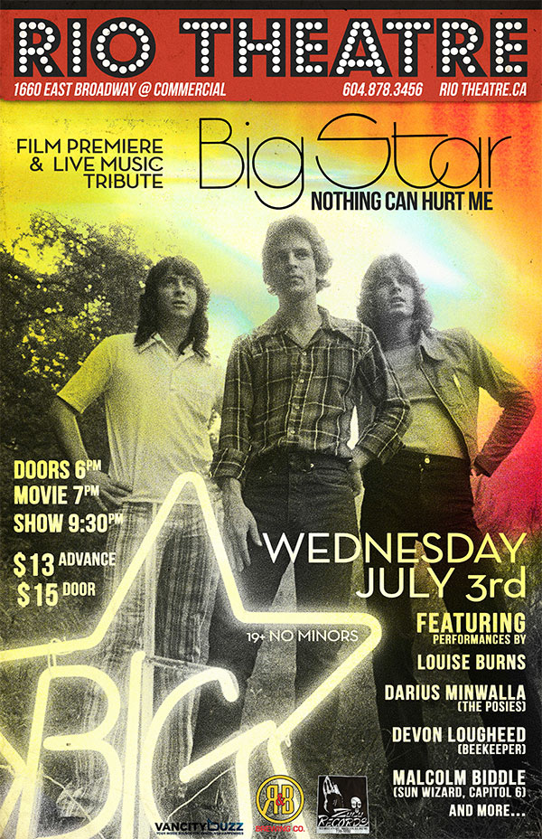 The evening will start with the Western Canadian Premiere of Big Star: Nothing Can Hurt Me, a feature-length documentary about the dismal commercial failure, subsequent massive critical acclaim, and enduring legacy of pop music's greatest cult phenomenon, Big Star, followed by a live tribute featuring performances from Louise Burns Music, Darius Minwalla ( The Posies), Malcolm Biddle (Sun Wizard) and Devon R Lougheed (beekeeper).
