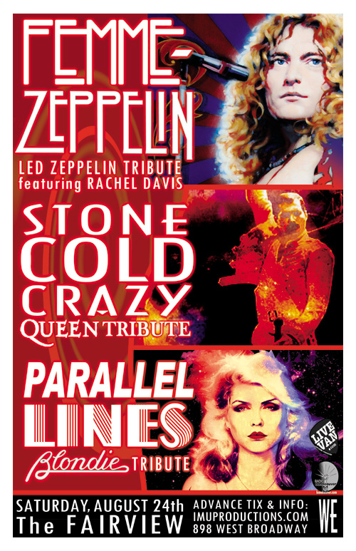 Saturday, August 24th IMU presents FEMME ZEPPELIN Led Zeppelin Tribute, STONE COLD CRAZY Queen Tribute & PARALLEL LINES Blondie Tribute @ The Fairview, 898 West Broadway. Doors 9pm / Purchase advance tickets online @ http://www.imuproductions.com/tix
