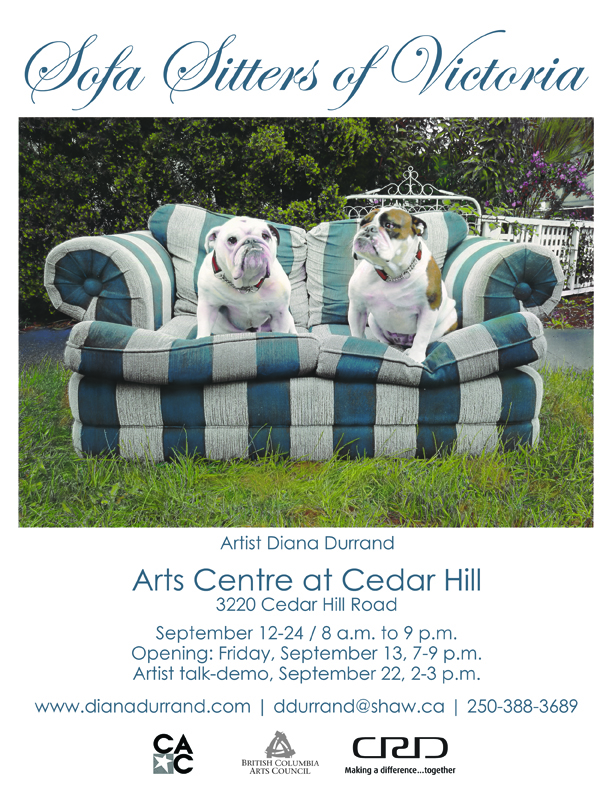 To most people sofas abandoned on the boulevards and streets of Victoria are an eyesore, but to Artist Diana Durrand these jettisoned pieces of family history have been the inspiration for her latest body of work. Over a two year period Diana has created her 40 piece Sofa Sitters of Victoria series, recruiting dozens of dogs, most as they were out for walks with their owners. The dogs were photographed sitting on the sofas, the images were then enlarged in black and white and hand coloured in gorgeous detail with chalk pastels. The effect is striking, resulting in images that are both comforting and jarring. The dogs add a sense of belonging to the strange, fragile settings. Opening night Sept.13 at the Arts Centre at Cedar Hill promises be a unique and very special event, with the participating dogs and their owners in attendance.