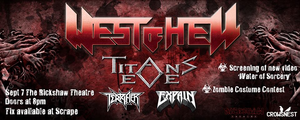 Vancouver, BC's WEST OF HELL, featuring vocalist Chris Valagao of ZIMMERS HOLE on vocals, have announced that their September 7th Vancouver, BC show at Rickshaw Theatre will be zombie-themed in celebration of the band's recent music video for "Water of Sorcery".