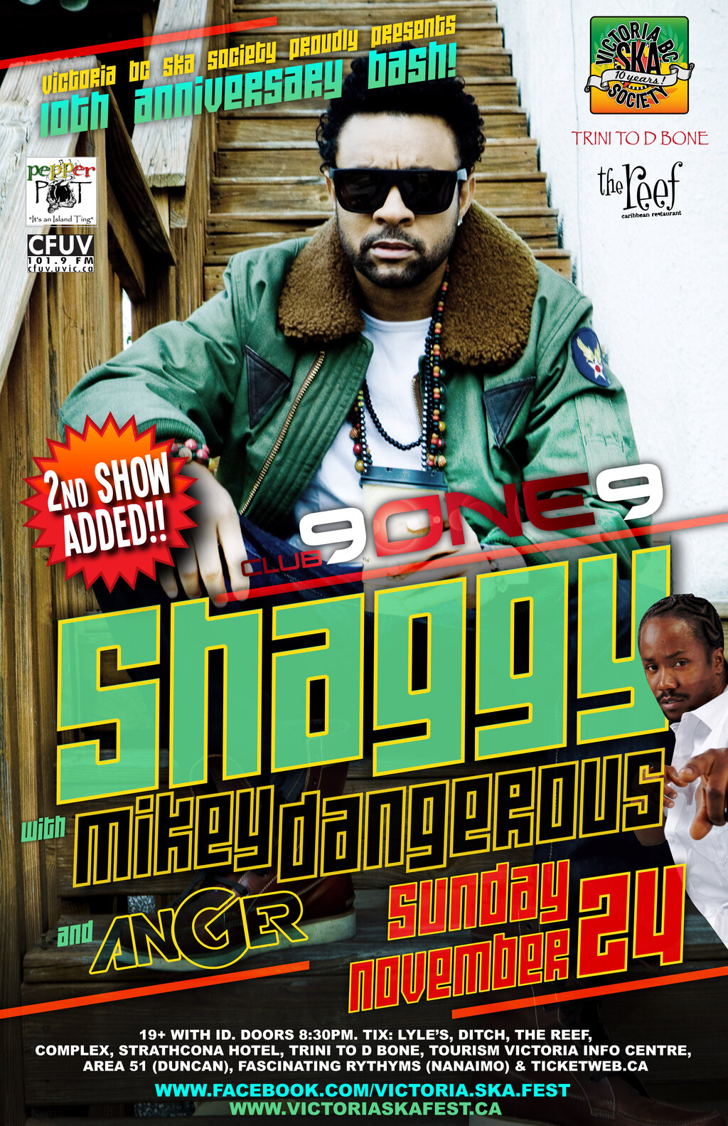 Victoria BC Ska Society proudly presents SHAGGY with Juno Award winning Mikey Dangerous and local party selector DJ Anger - Sunday, November 24th at Club 9ONE9. This show will be the 2nd of two Shaggy concerts at Club 9ONE9 as part of our ALL SHAGGY WEEKEND/10TH YEAR ANNIVERSARY BASH for Victoria BC Ska Society!