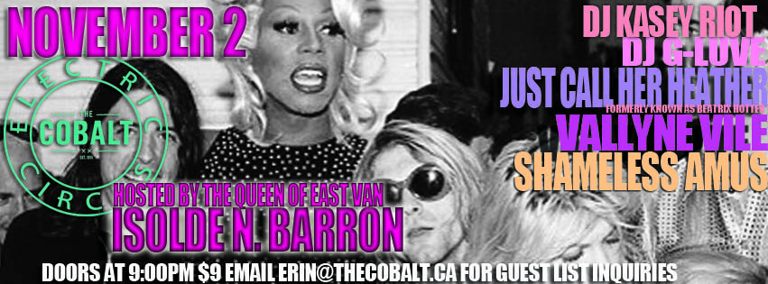 Electric Circus, Isoldes N. Barron, Just Call Her Heather  (Formerly known as Beatrix Hotter), Vallyne Vile, Shameless Amus, DJ Kasey Riot, Dj G-Luve @ The Cobalt Nov 2 2013 - Dec 22nd @ The Cobalt